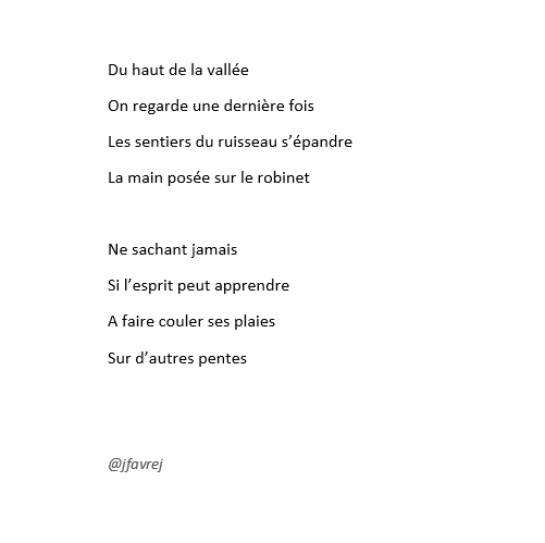 Du haut de la vallée On regarde une dernière fois Les sentiers du ruisseau s’épandre La main posée sur le robinet Ne sachant jamais Si l’esprit peut apprendre A faire couler ses plaies Sur d’autres pentes