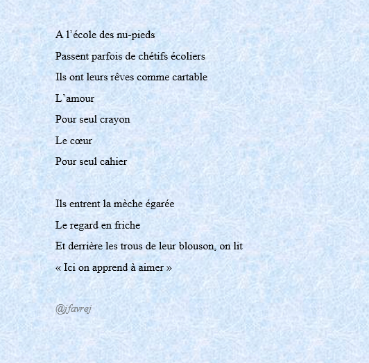A l’école des nu-pieds Passent parfois de chétifs écoliers Ils ont leurs rêves comme cartable L’amour Pour seul crayon Le cœur Pour seul cahier Ils entrent la mèche égarée Le regard en friche Et derrière les trous de leur blouson, on lit « Ici on apprend à aimer »