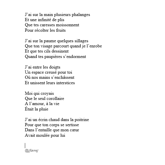 J’ai sur la main plusieurs phalanges Et une infinité de plis Que tes caresses moissonnent Pour récolter les fruits J’ai sur la paume quelques sillages Que ton visage parcourt quand je l’enrobe Et que tes cils dessinent Quand tes paupières s’endorment J’ai entre les doigts Un espace creusé pour toi Où nos mains s’enchâssent EtLire la suite « J’ai sur la main »